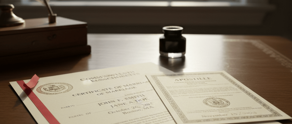 Massachusetts marriage certificate apostille services for international use. Professional Boston apostille support for certified copies, legal filings, immigration, and overseas marriage requirements.