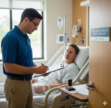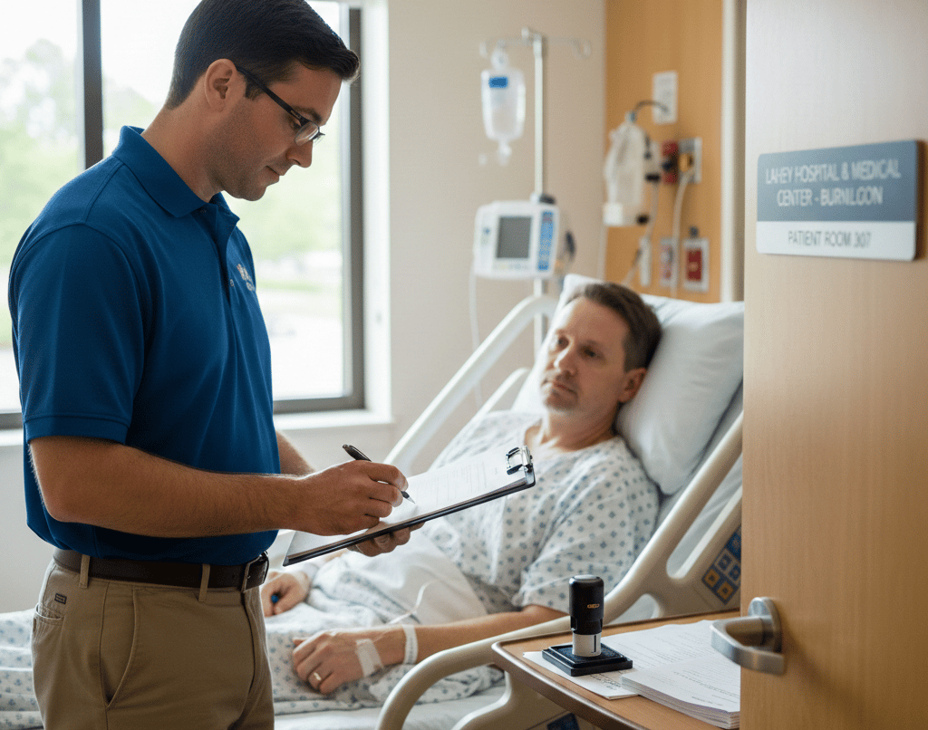 The notary verifies ID, checks willingness, confirms understanding, and prepares the document for signing. This is a calm and respectful process designed for hospital environments.
