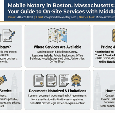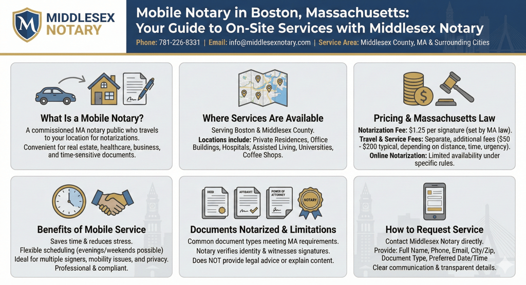 This page explains how mobile notary services work in Boston, what to expect, pricing guidelines under Massachusetts law, and how to request service.